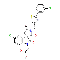 | SMILES | O=C(O)CN1C(=O)C2(CC(=O)N(Cc3csc(-c4cccc(Cl)c4)n3)C2=O)c2cc(Cl)ccc21 |