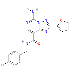 | SMILES | CNc1ncc(C(=O)NCc2ccc(Cl)cc2)c2nc(-c3ccco3)nn12 |