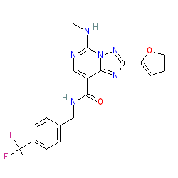 | SMILES | CNc1ncc(C(=O)NCc2ccc(C(F)(F)F)cc2)c2nc(-c3ccco3)nn12 |