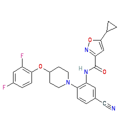 | SMILES | N#Cc1ccc(N2CCC(Oc3ccc(F)cc3F)CC2)c(NC(=O)c2cc(C3CC3)on2)c1 |