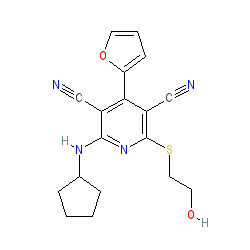 | SMILES | N#Cc1c(NC2CCCC2)nc(SCCO)c(C#N)c1-c1ccco1 |