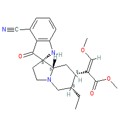 | SMILES | CC[C@@H]1CN2CC[C@]3(Nc4cccc(C#N)c4C3=O)[C@@H]2C[C@@H]1/C(=C\OC)C(=O)OC |