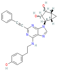 | SMILES | Oc1ccc(CCNc2nc(C#Cc3ccccc3)nc3c2ncn3[C@H]2[C@H](O)[C@H](O)[C@@H]3C[C@@H]32)cc1 |