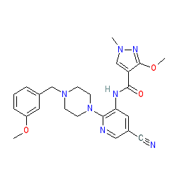 | SMILES | COc1cccc(CN2CCN(c3ncc(C#N)cc3NC(=O)c3cn(C)nc3OC)CC2)c1 |
