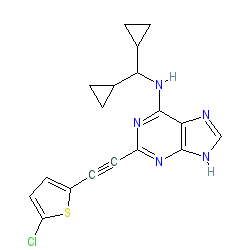 | SMILES | Clc1ccc(C#Cc2nc(NC(C3CC3)C3CC3)c3nc[nH]c3n2)s1 |