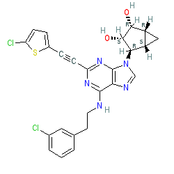 | SMILES | O[C@@H]1[C@H](O)[C@@H]2C[C@@H]2[C@H]1n1cnc2c(NCCc3cccc(Cl)c3)nc(C#Cc3ccc(Cl)s3)nc21 |