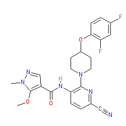 | SMILES | COc1c(C(=O)Nc2ccc(C#N)nc2N2CCC(Oc3ccc(F)cc3F)CC2)cnn1C |