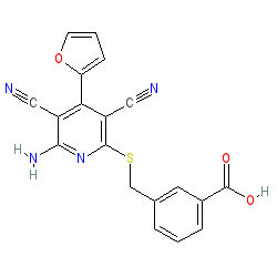 | SMILES | N#Cc1c(N)nc(SCc2cccc(C(=O)O)c2)c(C#N)c1-c1ccco1 |