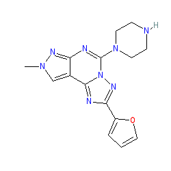 | SMILES | Cn1cc2c(nc(N3CCNCC3)n3nc(-c4ccco4)nc23)n1 |