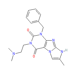 | SMILES | Cc1cn2c(nc3c2c(=O)n(CCN(C)C)c(=O)n3Cc2ccccc2)[nH]1 |