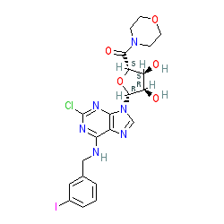 | SMILES | O=C([C@H]1O[C@@H](n2cnc3c(NCc4cccc(I)c4)nc(Cl)nc32)[C@H](O)[C@@H]1O)N1CCOCC1 |
