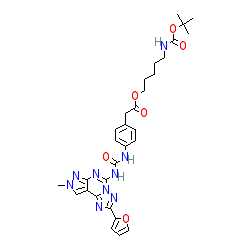 | SMILES | Cn1cc2c(nc(NC(=O)Nc3ccc(CC(=O)OCCCCCNC(=O)OC(C)(C)C)cc3)n3nc(-c4ccco4)nc23)n1 |
