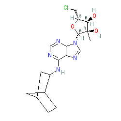 | SMILES | C[C@@]1(O)[C@H](O)[C@@H](CCl)O[C@H]1n1cnc2c(NC3CC4CCC3C4)ncnc21 |