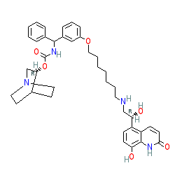 | SMILES | O=C(NC(c1ccccc1)c1cccc(OCCCCCCCNC[C@H](O)c2ccc(O)c3[nH]c(=O)ccc23)c1)O[C@H]1CN2CCC1CC2 |