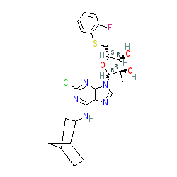 | SMILES | C[C@@]1(O)[C@H](O)[C@@H](CSc2ccccc2F)O[C@H]1n1cnc2c(NC3CC4CCC3C4)nc(Cl)nc21 |