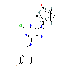 | SMILES | O[C@@H]1[C@H](O)[C@@H]2C[C@@H]2[C@H]1n1cnc2c(NCc3cccc(Br)c3)nc(Cl)nc21 |