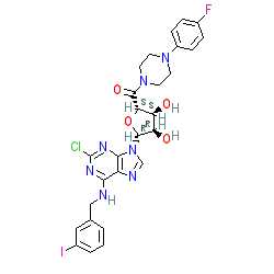 | SMILES | O=C([C@H]1O[C@@H](n2cnc3c(NCc4cccc(I)c4)nc(Cl)nc32)[C@H](O)[C@@H]1O)N1CCN(c2ccc(F)cc2)CC1 |