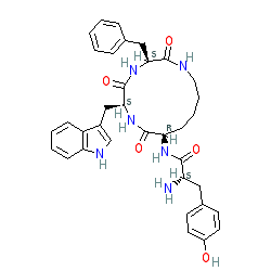 | SMILES | N[C@@H](Cc1ccc(O)cc1)C(=O)N[C@@H]1CCCCNC(=O)[C@H](Cc2ccccc2)NC(=O)[C@H](Cc2c[nH]c3ccccc23)NC1=O |