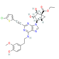 | SMILES | CCOC(=O)[C@@]12C[C@@H]1[C@@H](n1cnc3c(NCCc4ccc(O)c(OC)c4)nc(C#Cc4ccc(Cl)s4)nc31)[C@H](O)[C@@H]2O |