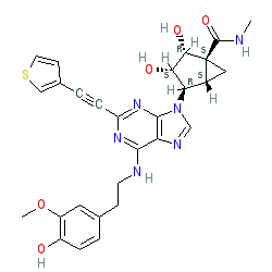 | SMILES | CNC(=O)[C@@]12C[C@@H]1[C@@H](n1cnc3c(NCCc4ccc(O)c(OC)c4)nc(C#Cc4ccsc4)nc31)[C@H](O)[C@@H]2O |