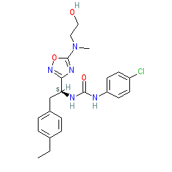 | SMILES | CCc1ccc(C[C@H](NC(=O)Nc2ccc(Cl)cc2)c2noc(N(C)CCO)n2)cc1 |