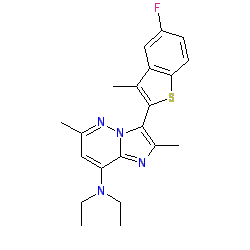 | SMILES | CCN(CC)c1cc(C)nn2c(-c3sc4ccc(F)cc4c3C)c(C)nc12 |