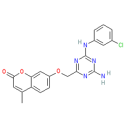| SMILES | Cc1cc(=O)oc2cc(OCc3nc(N)nc(Nc4cccc(Cl)c4)n3)ccc12 |