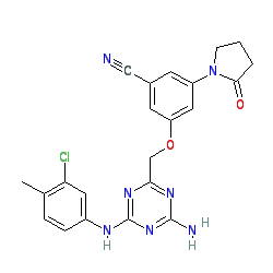 | SMILES | Cc1ccc(Nc2nc(N)nc(COc3cc(C#N)cc(N4CCCC4=O)c3)n2)cc1Cl |