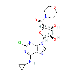 | SMILES | O=C([C@H]1O[C@@H](n2cnc3c(NC4CC4)nc(Cl)nc32)[C@H](O)[C@@H]1O)N1CCOCC1 |