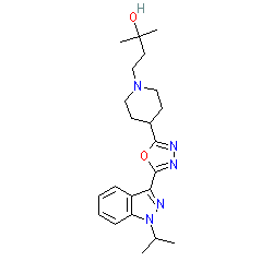 | SMILES | CC(C)n1nc(-c2nnc(C3CCN(CCC(C)(C)O)CC3)o2)c2ccccc21 |
