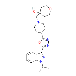 | SMILES | CC(C)n1nc(-c2nnc(C3CCN(CC4(O)CCOCC4)CC3)o2)c2ccccc21 |