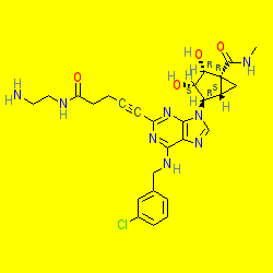 | SMILES | CNC(=O)[C@]12C[C@@H]1[C@@H](n1cnc3c(NCc4cccc(Cl)c4)nc(C#CCCC(=O)NCCN)nc31)[C@H](O)[C@@H]2O |