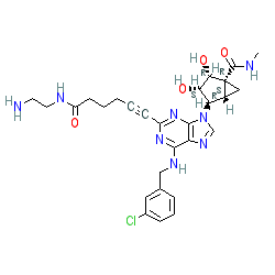 | SMILES | CNC(=O)[C@]12C[C@@H]1[C@@H](n1cnc3c(NCc4cccc(Cl)c4)nc(C#CCCCC(=O)NCCN)nc31)[C@H](O)[C@@H]2O |