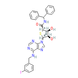| SMILES | O=C(NC(c1ccccc1)c1ccccc1)[C@H]1S[C@@H](n2cnc3c(NCc4cccc(I)c4)ncnc32)[C@H](O)[C@@H]1O |