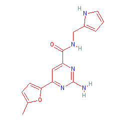 | SMILES | Cc1ccc(-c2cc(C(=O)NCc3ccc[nH]3)nc(N)n2)o1 |