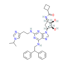 | SMILES | CC(C)n1cnc(CCNc2nc(NCC(c3ccccc3)c3ccccc3)c3ncn([C@@H]4C[C@H](NC(=O)C5CCC5)[C@@H](O)[C@H]4O)c3n2)c1 |