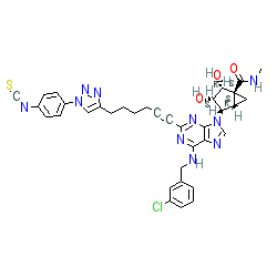 | SMILES | CNC(=O)[C@@]12C[C@@H]1[C@@H](n1cnc3c(NCc4cccc(Cl)c4)nc(C#CCCCCc4cn(-c5ccc(N=C=S)cc5)nn4)nc31)[C@H](O)[C@@H]2O |