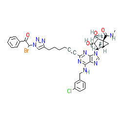 | SMILES | CNC(=O)[C@@]12C[C@@H]1[C@@H](n1cnc3c(NCc4cccc(Cl)c4)nc(C#CCCCCc4cn(C(Br)C(=O)c5ccccc5)nn4)nc31)[C@H](O)[C@@H]2O |