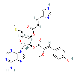 | SMILES | CO/C(=C\c1ccc(O)cc1)C(=O)O[C@@H]1[C@H](OC(=O)/C=C/c2c[nH]cn2)[C@@H](CSC)O[C@H]1n1cnc2c(N)ncnc21 |