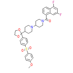 | SMILES | COc1ccc(S(=O)(=O)c2ccc(C3(C4CCN(C5CCN(C(=O)c6cccc7c(F)cc(F)cc67)CC5)CC4)OCCO3)cc2)cc1 |