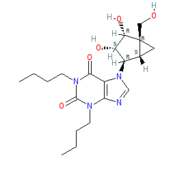 | SMILES | CCCCn1c(=O)c2c(ncn2[C@H]2[C@H](O)[C@H](O)[C@]3(CO)C[C@H]23)n(CCCC)c1=O |