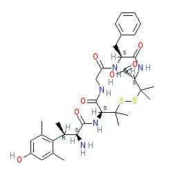 | SMILES | Cc1cc(O)cc(C)c1[C@@H](C)[C@H](N)C(=O)N[C@H]1C(=O)NCC(=O)N[C@@H](Cc2ccccc2)C(=O)N[C@@H](C(=O)O)C(C)(C)SSC1(C)C |