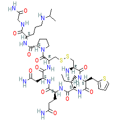 | SMILES | CC[C@H](C)[C@@H]1NC(=O)[C@H](Cc2cccs2)NC(=O)[C@@H](N)CSSC[C@@H](C(=O)N2CCC[C@H]2C(=O)N[C@@H](CCCNC(C)C)C(=O)NCC(N)=O)NC(=O)[C@H](CC(N)=O)NC(=O)[C@H](CCC(N)=O)NC1=O |
