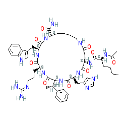 | SMILES | CCCC[C@H](NC(C)=O)C(=O)N[C@H]1CC(=O)NCCCC[C@@H](C(N)=O)NC(=O)[C@H](Cc2c[nH]c3ccccc23)NC(=O)[C@H](CCCN=C(N)N)NC(=O)[C@H]([C@@H](C)c2ccccc2)NC(=O)[C@H](Cc2c[nH]cn2)NC1=O |