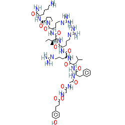 | SMILES | CC[C@H](C)[C@H](NC(=O)[C@H](CCCN=C(N)N)NC(=O)[C@H](CCCN=C(N)N)NC(=O)[C@H](CC(C)C)NC(=O)[C@H](Cc1ccccc1)NC(=O)CNC(=O)CNOC(=O)CCc1ccc(O)cc1)C(=O)N[C@@H](CCCN=C(N)N)C(=O)N1CCC[C@H]1C(=O)N[C@@H](CCCCN)C(N)=O |