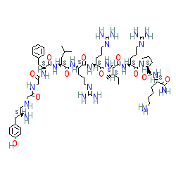 | SMILES | CC[C@H](C)[C@H](NC(=O)[C@H](CCCN=C(N)N)NC(=O)[C@H](CCCN=C(N)N)NC(=O)[C@H](CC(C)C)NC(=O)[C@H](Cc1ccccc1)NC(=O)CNC(=O)CNC[C@@H](N)Cc1ccc(O)cc1)C(=O)N[C@@H](CCCN=C(N)N)C(=O)N1CCC[C@H]1C(=O)N[C@@H](CCCCN)C(N)=O |