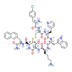 | SMILES | C[C@H](O)[C@H]1NC(=O)[C@H](CCCCN)NC(=O)[C@@H](Cc2c[nH]c3ccccc23)N(C)C(=O)[C@H](Cc2cccnc2)NC(=O)[C@@H](NC(=O)[C@@H](N)Cc2ccc(Cl)cc2)CSSC[C@H](C(=O)N[C@@H](Cc2ccc3ccccc3c2)C(N)=O)NC1=O |