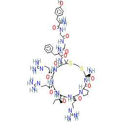| SMILES | CC[C@H](C)[C@@H]1NC(=O)[C@H](CCCN=C(N)N)NC(=O)[C@H](CCCN=C(N)N)NC(=O)[C@H](NC(=O)[C@H](Cc2ccccc2)NC(=O)CNC(=O)CNC(=O)[C@@H](N)Cc2ccc(O)cc2)C(C)(C)SCCSC[C@@H](C(N)=O)NC(=O)[C@@H]2CCCN2C(=O)[C@H](CCCN=C(N)N)NC1=O |