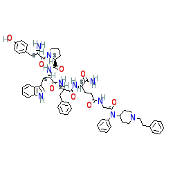 | SMILES | NC(=O)[C@H](CCC(=O)NCC(=O)N(c1ccccc1)C1CCN(CCc2ccccc2)CC1)NC(=O)[C@H](Cc1ccccc1)NC(=O)[C@H](Cc1c[nH]c2ccccc12)NC(=O)[C@@H]1CCCN1C(=O)[C@@H](N)Cc1ccc(O)cc1 |