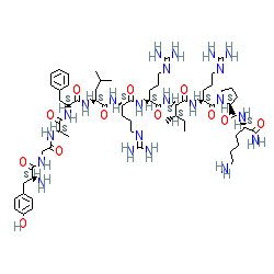 | SMILES | CC[C@H](C)[C@H](NC(=O)[C@H](CCCN=C(N)N)NC(=O)[C@H](CCCN=C(N)N)NC(=O)[C@H](CC(C)C)NC(=O)[C@H](Cc1ccccc1)NC(=O)[C@H](C)NC(=O)CNC(=O)[C@@H](N)Cc1ccc(O)cc1)C(=O)N[C@@H](CCCN=C(N)N)C(=O)N1CCC[C@H]1C(=O)N[C@@H](CCCCN)C(N)=O |